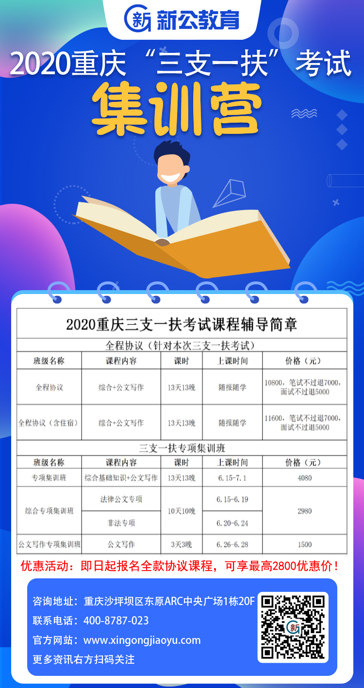 【導(dǎo)語】2020重慶三支一扶招錄547人公告現(xiàn)已發(fā)布,新公教育 為廣大考生準(zhǔn)備了此次考試的輔導(dǎo)課程,望各位考生及時(shí)備考爭取早日上岸。新公教 育為報(bào)考重慶事業(yè)單位考生提供備考資料、輔導(dǎo)用書、真題講義、筆試課程等內(nèi)容, 歡迎各位考生加入備考QQ群 951111480一起學(xué)習(xí)!